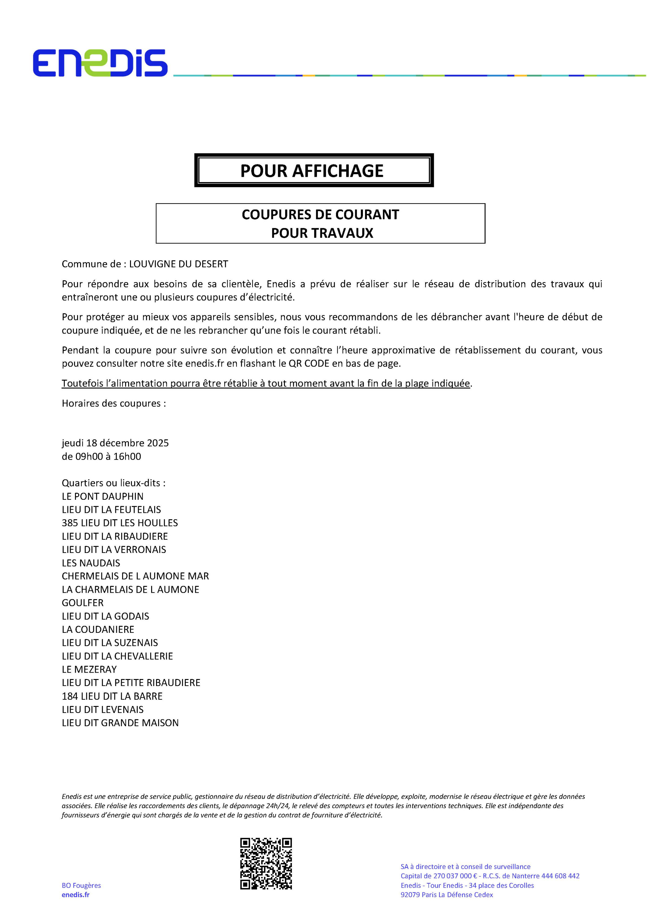 Pour répondre aux besoins de sa clientèle, Enedis a prévu de réaliser sur le réseau de distribution des travaux qui entraîneront une ou plusieurs coupures d’électricité