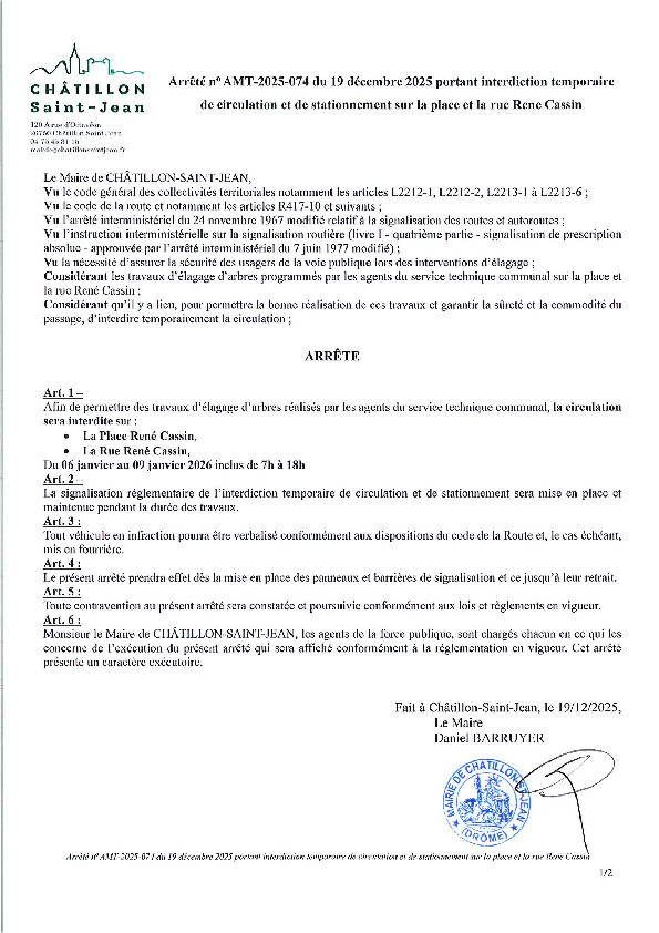 interdiction temporaire de circulation et de stationnement sur la place et la rue René Cassin du 06 au 09 janvier 2026