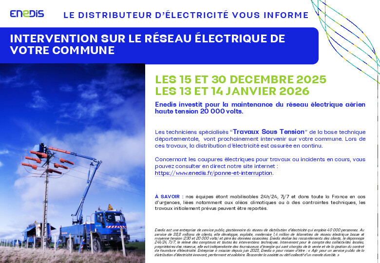 Pour suivre l'Ă©volution de la coupure et connaĂźtre l'heure approximative de rĂ©tablissement du courant, vous pouvez consulter notre site enedis.fr/panne-et-interruption. Toutefois l'alimentation pourra ĂȘtre rĂ©tablie Ă tout moment avant la fin de la plage indiquĂ©e.