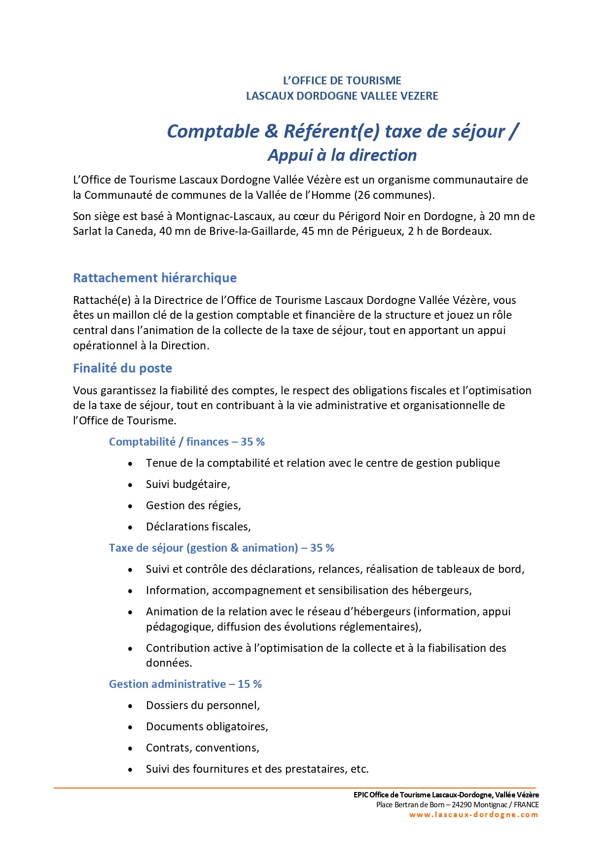 L’Office de Tourisme Lascaux Dordogne Vallée Vézère recherche un(e) Comptable & Référent(e) taxe de séjour / Appui à la direction.