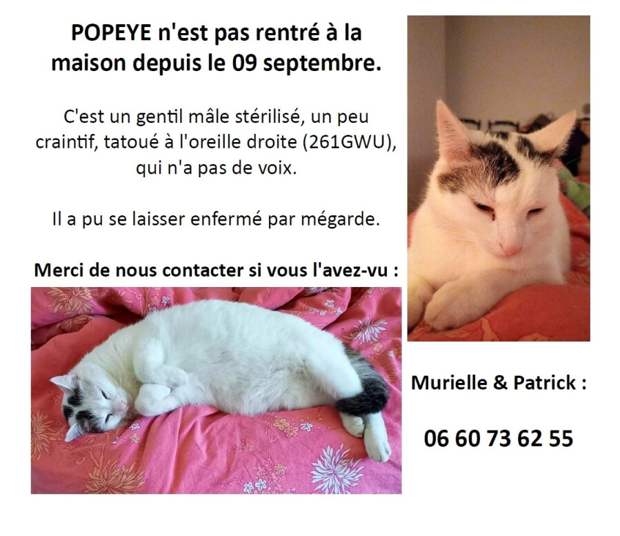 Ses maîtres le recherchent depuis le 9 septembre, vérifiez vos caves, grange ou tout dépendance où il aurait pu se réfugier par peur. Merci de votre aide