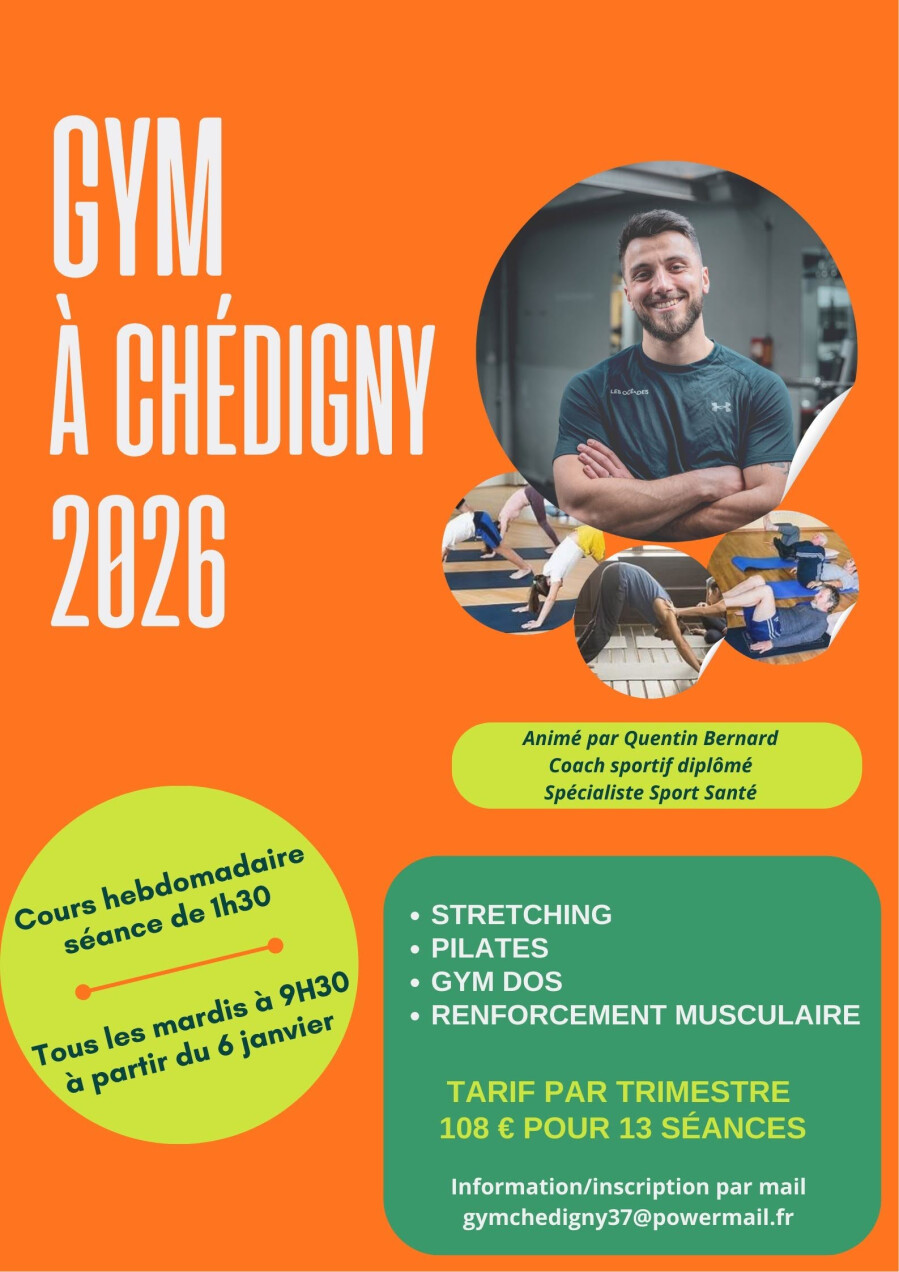 Pour saluer l'entrée dans cette année 2026, retrouvons nous demain mardi 6 janvier à 9h30 à la des fêtes de Chédigny. L'occasion de nous rencontrer et de tester les propositions de gym qui vous sont faites par Quentin Bernard, coach chédignois.