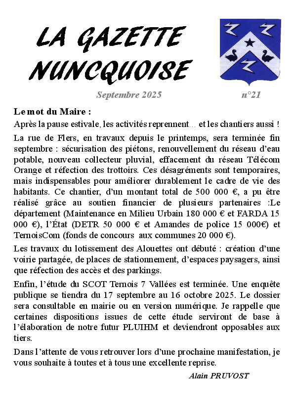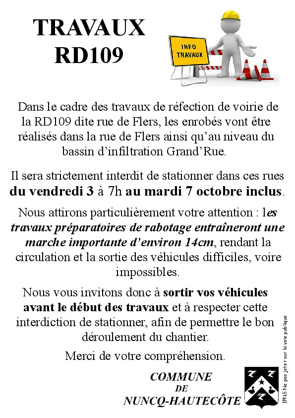 La Municipalité informe les habitants que des travaux de réfection de voirie auront lieu sur la RDV 109 dite rue de Flers, ainsi qu’au niveau du bassin d’infiltration, Grand’Rue.