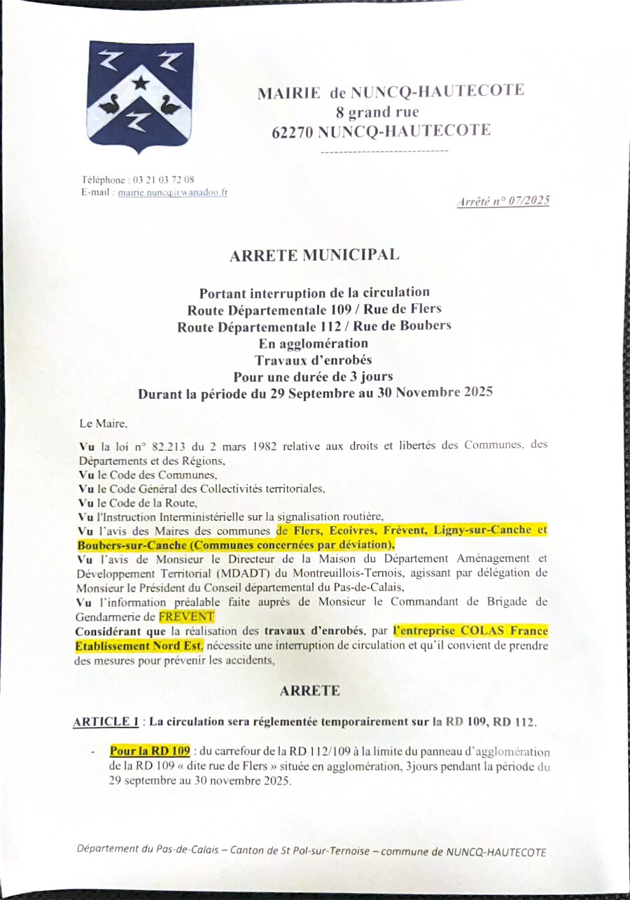 Afin d’assurer la sécurité de tous et de permettre le bon déroulement des travaux, un arrêté municipal a été pris pour réglementer temporairement la circulation et le stationnement sur la RD109 rue de Flers.