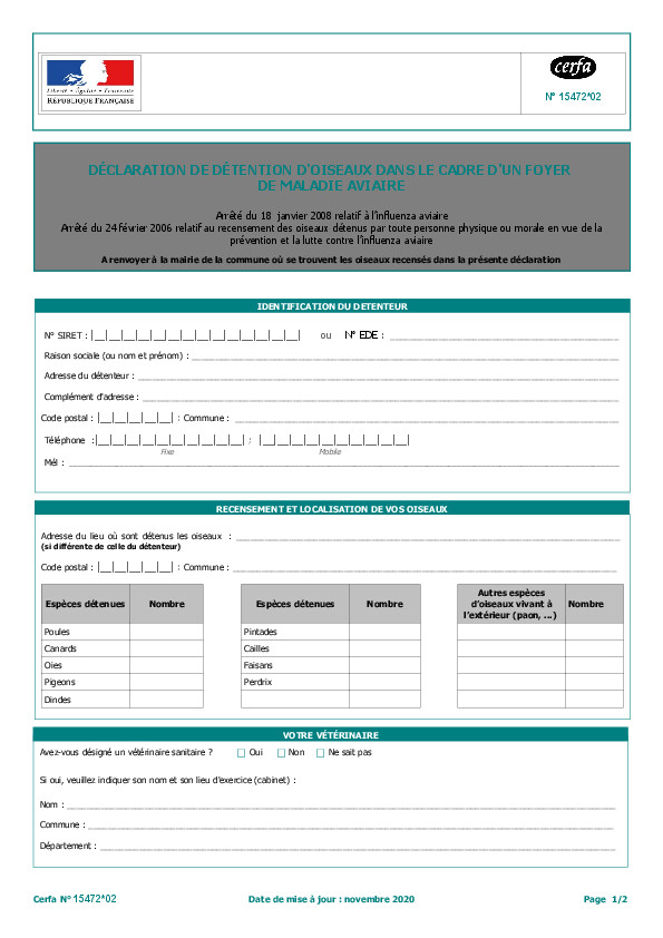 Je vous rappelle en complément, que tout détenteur d'oiseaux domestiques (volailles ou oiseaux d'agrément) est tenu de faire une déclaration auprès de vos services.