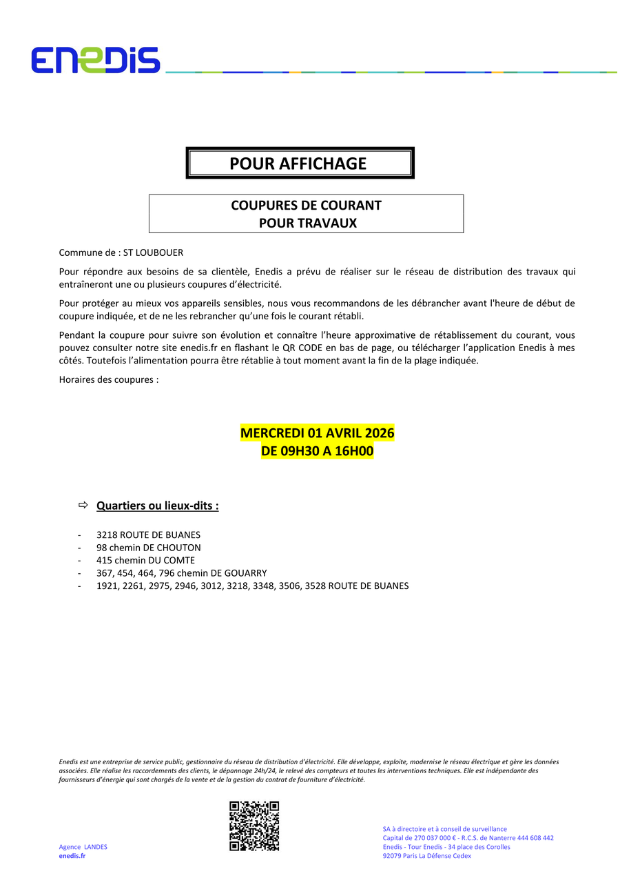 POUR TRAVAUX LE MERCREDI 01 AVRIL 2026 DE 09H30 A 16H00 ⚡️