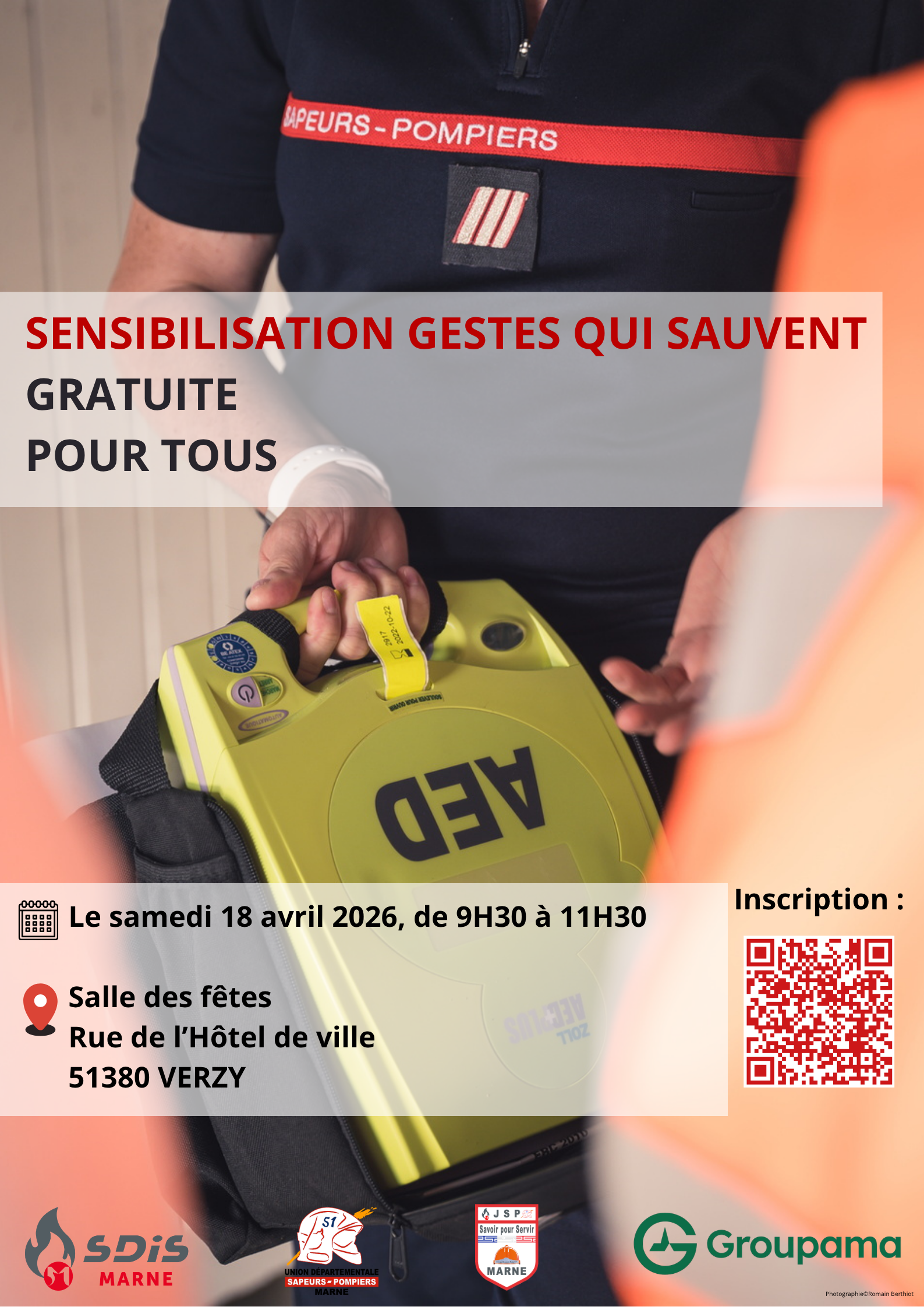 Les sapeurs-pompiers de Verzenay organisent une sensibilisation aux gestes qui sauvent pour tous (à partir de 10 ans) dans le cadre d'un partenariat entre le SDIS de la Marne et son partenaire Groupama.