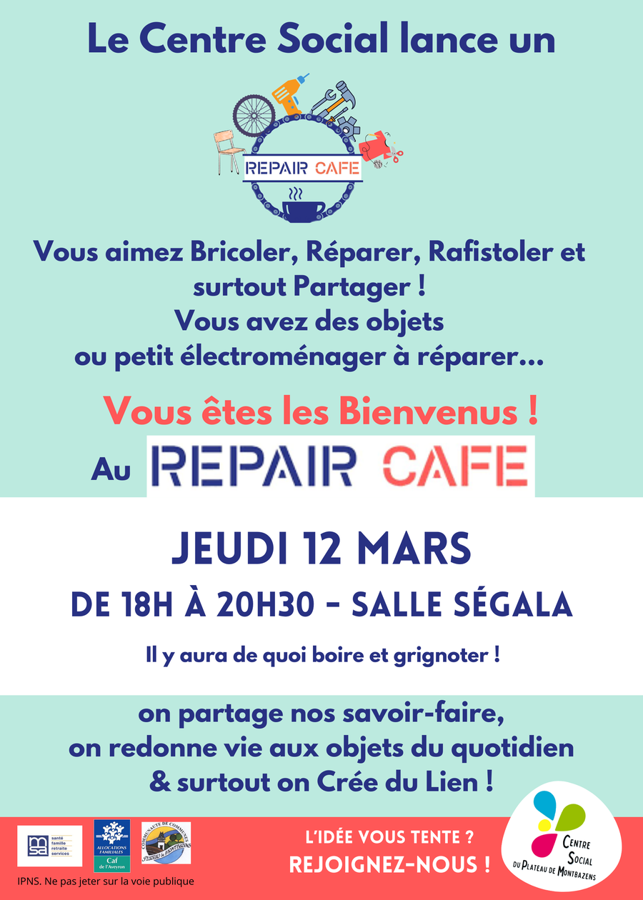 Nous vous donnons rendez-vous 𝐜𝐞 𝐣𝐞𝐮𝐝𝐢 𝟏𝟐 𝐦𝐚𝐫𝐬 𝐝𝐞 𝟏𝟖𝐡𝟑𝟎 𝐚̀ 𝟐𝟎𝐡𝟑𝟎 au Centre Social de Montbazens pour un nouveau 𝐑𝐞𝐩𝐚𝐢𝐫 𝐂𝐚𝐟𝐞́ !