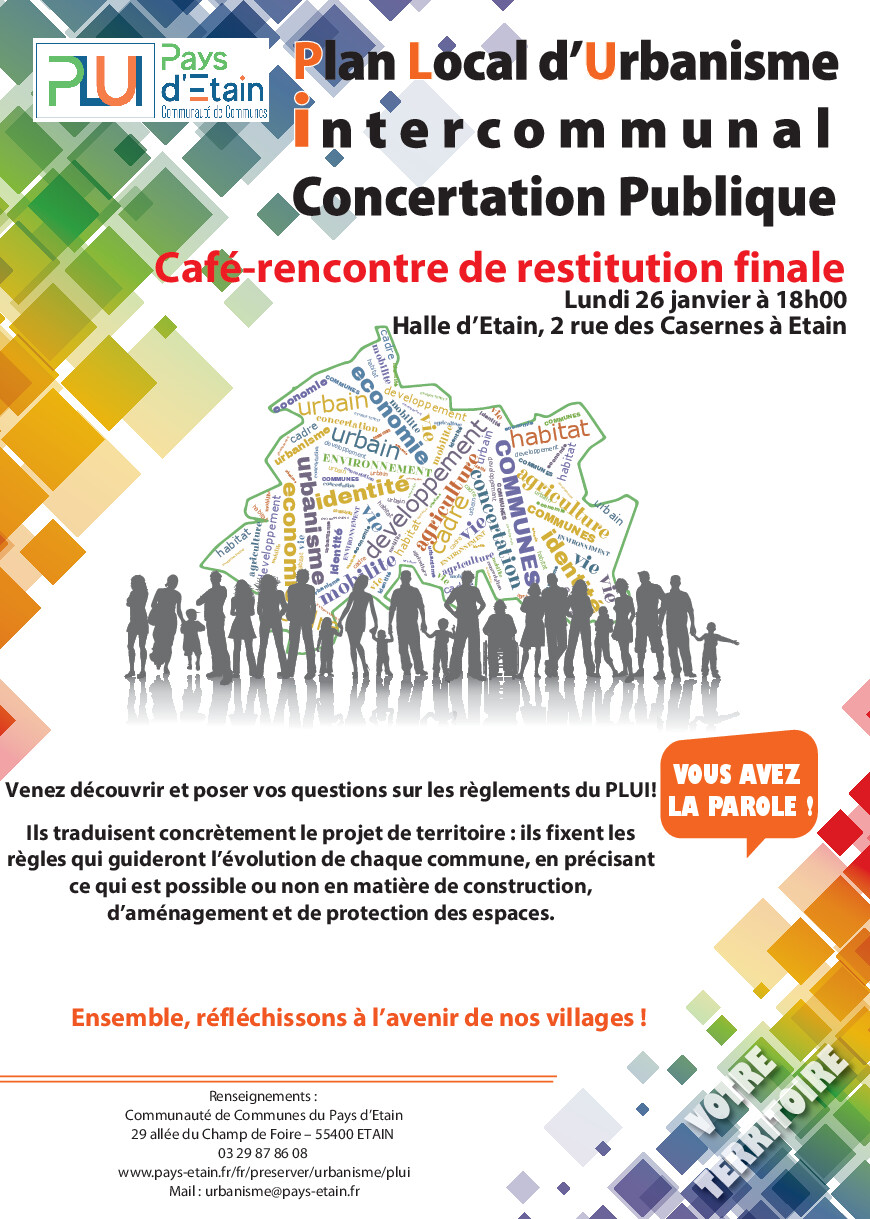 Nous entrons désormais dans la phase finale de concertation, au cours de laquelle seront présentés les règlements du PLUi (règlement écrit et zonage). Il s’agit d’un moment important: vous pourrez comprendre les choix proposés, poser vos questions et formuler vos
