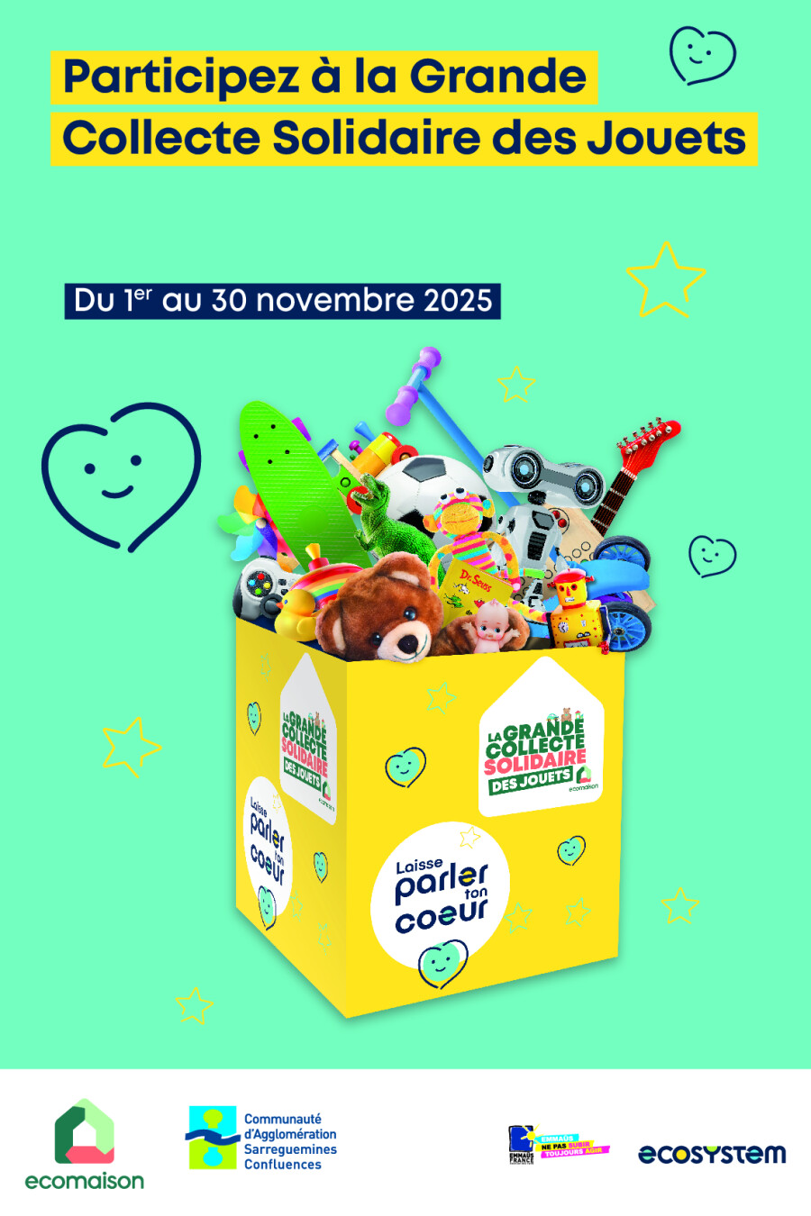 Du 1er eu 30 novembre 2025, vous pouvez déposer en mairie d'Hazembourg ou directement à la mairie de Kappelkinger tous les jouets que vous n'utilisez plus : jouets électriques et électroniques, en bois, de construction, de société, peluches, poupées,…