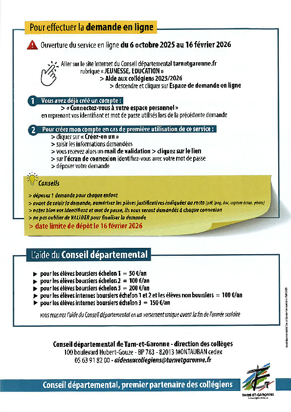 Campagne annuelle de l'aide aux collégiens pour l'année scolaire 2025/2026.