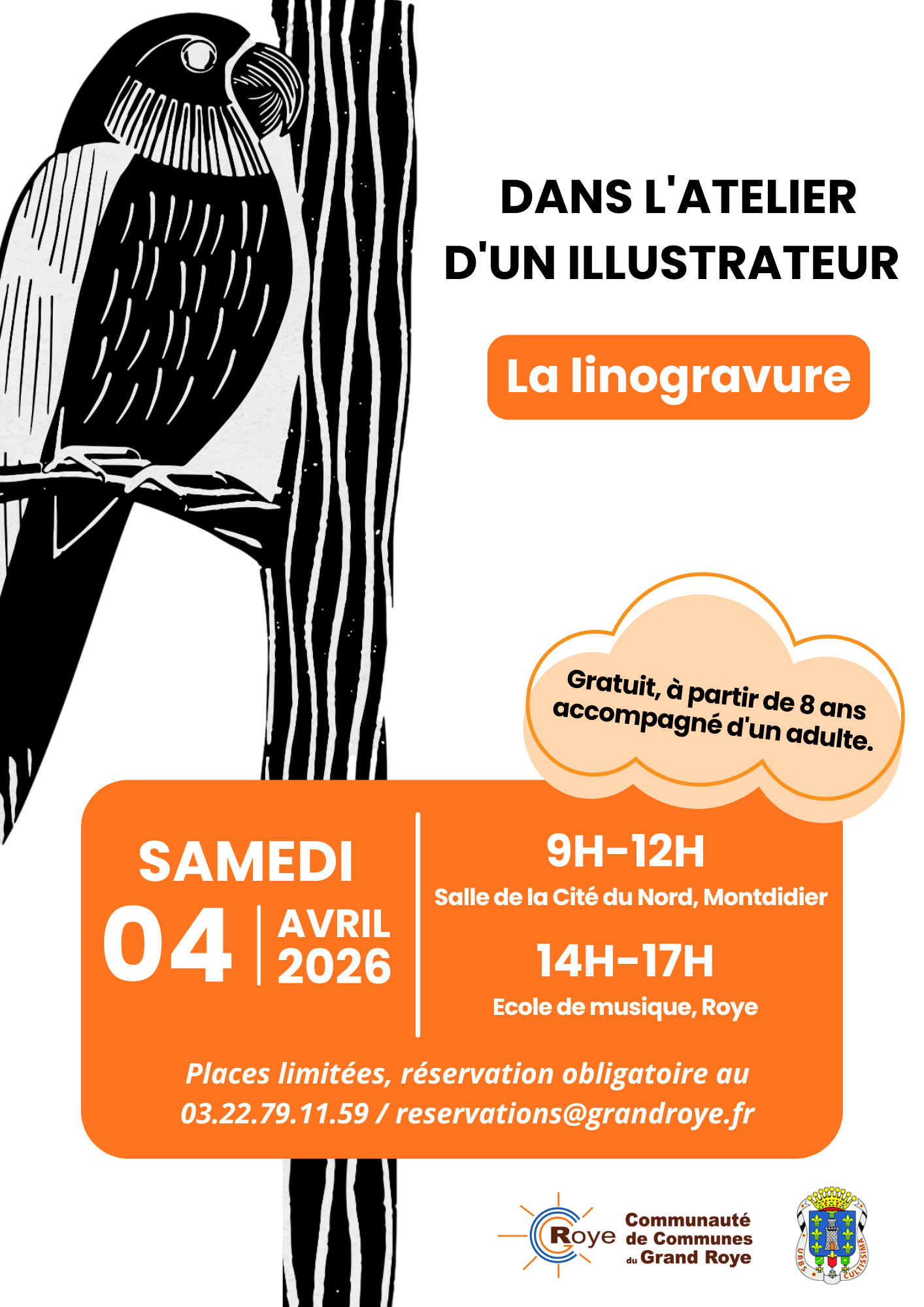 Voici une nouvelle affiche pour un atelier de linogravure (dés l'âge de 8 ans accompagné) le samedi 4 avril 2026.