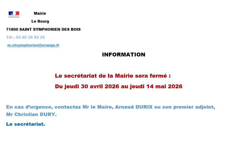 Le secretariat sera fermé du Jeudi 30 Avril au Jeudi 14 Mai inclus.