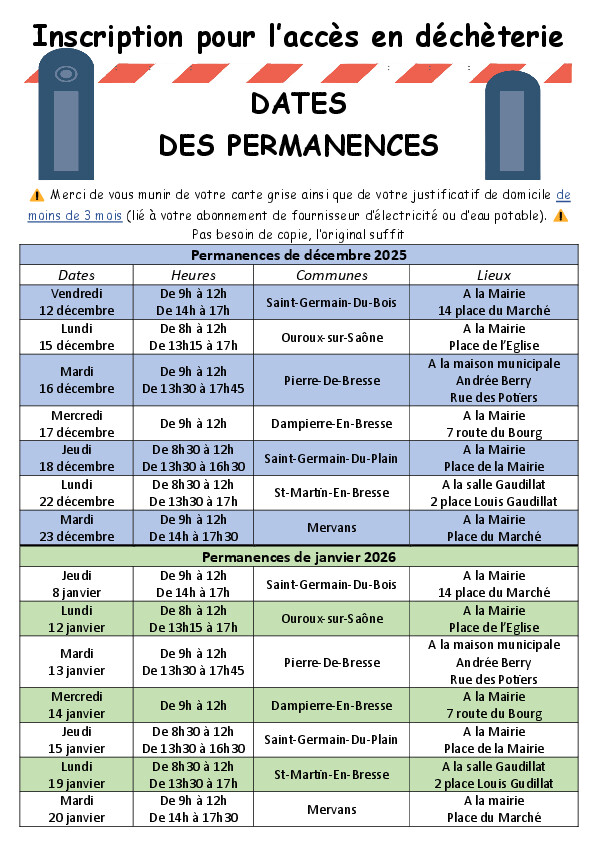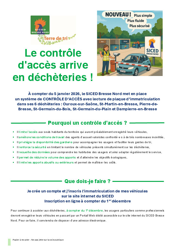 À compter du 5 janvier 2026, le SICED Bresse Nord met en place un système de contrôle d’accès avec lecture de plaque d’immatriculation dans ses 6 déchèteries situées à :