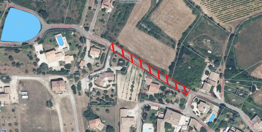 Dans le cadre des travaux de création du réseau d’eaux usées réalisés par l’entreprise SAUR, la circulation sera interdite sur la route de la Piscine (secteur en rouge sur le plan ci-dessous).