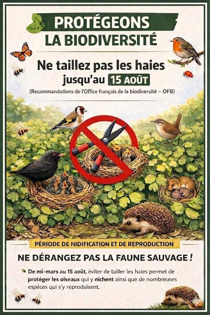 il est fortement recommandé de ne pas tailler les haies du 15 mars au 15 août 2026.