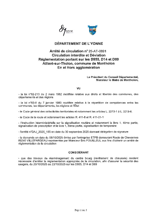 Du 20/10 au 23/10/2025 la circulation des véhicules est interdite de jour comme de nuit à Aillant-sur-Tholon.