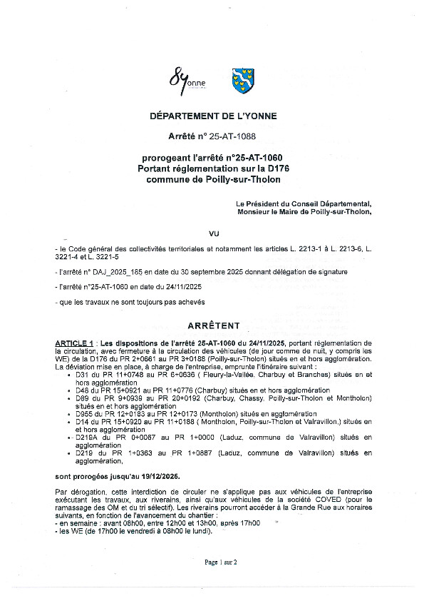 Les travaux sur la RD 176 (Grande Rue à Poilly) (Route barrée) sont prolongés jusqu'au 19 décembre 2025 inclus, le point d’arrêt POILLY/THOLON-ABRI RUE ST GERMAIN ne pourra pas être desservi.