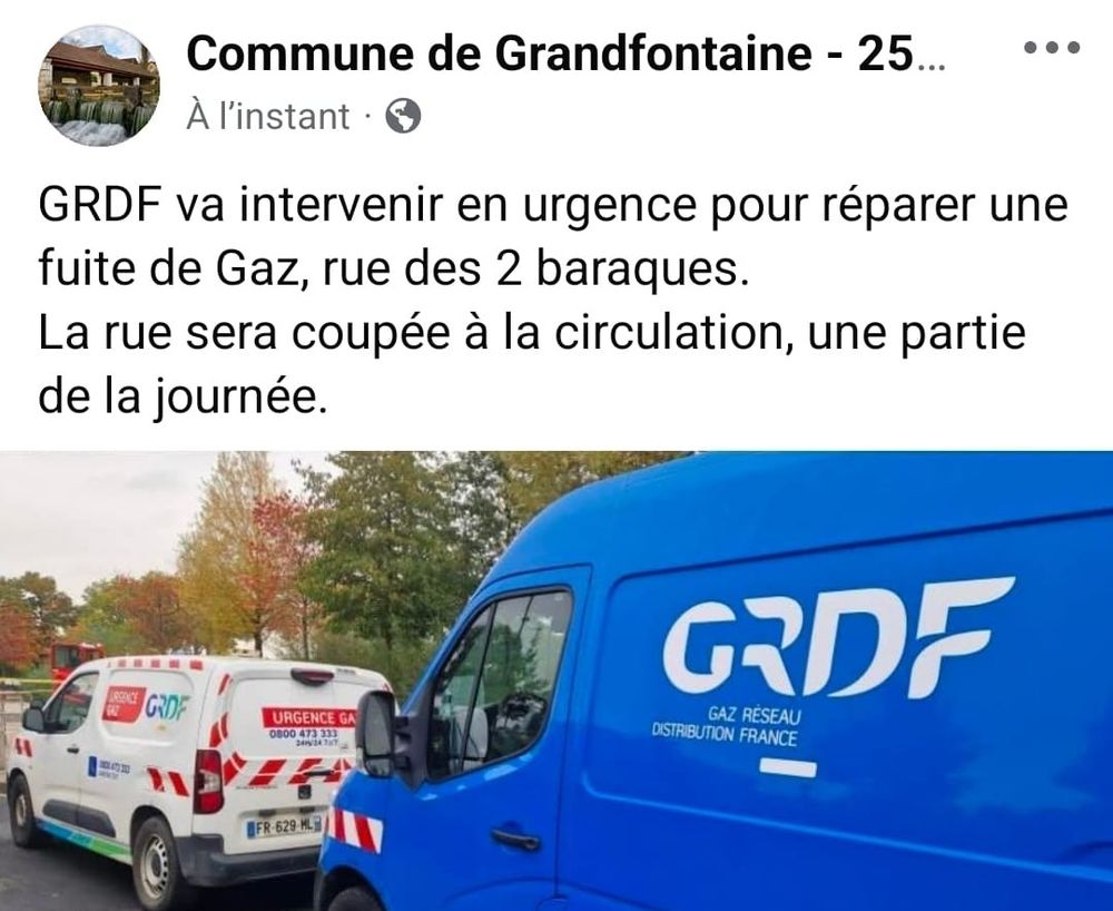 Intervention en cours suite à une fuite de gaz rue des deux baraques.
