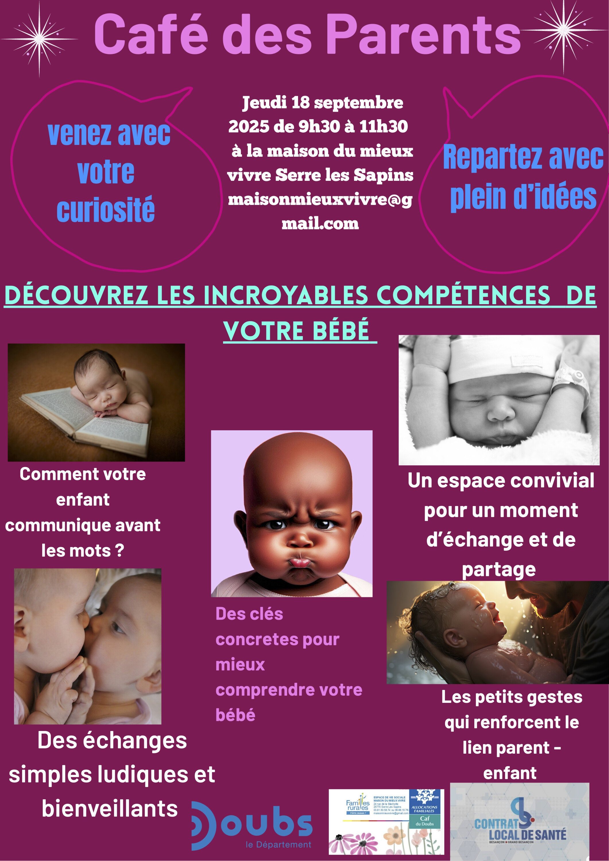 Ce rendez-vous, destiné aux jeunes parents et aux familles des communes environnantes, se tiendra chaque troisième jeudi du mois de 9h30 à 11h30, à la Maison du Mieux Vivre de Serre-les-Sapins. Il permettra d’aborder différentes thématiques autour de la parentalité, lors de temps d’échanges conviviaux et enrichissants.
