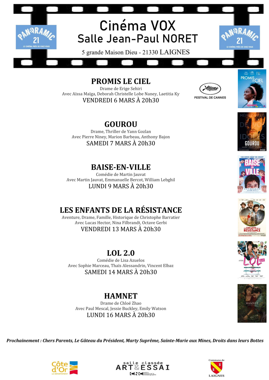 Voici le programme de la quinzaine, du 6 mars au 16 mars 2026, au Cinéma VOX de LAIGNES :