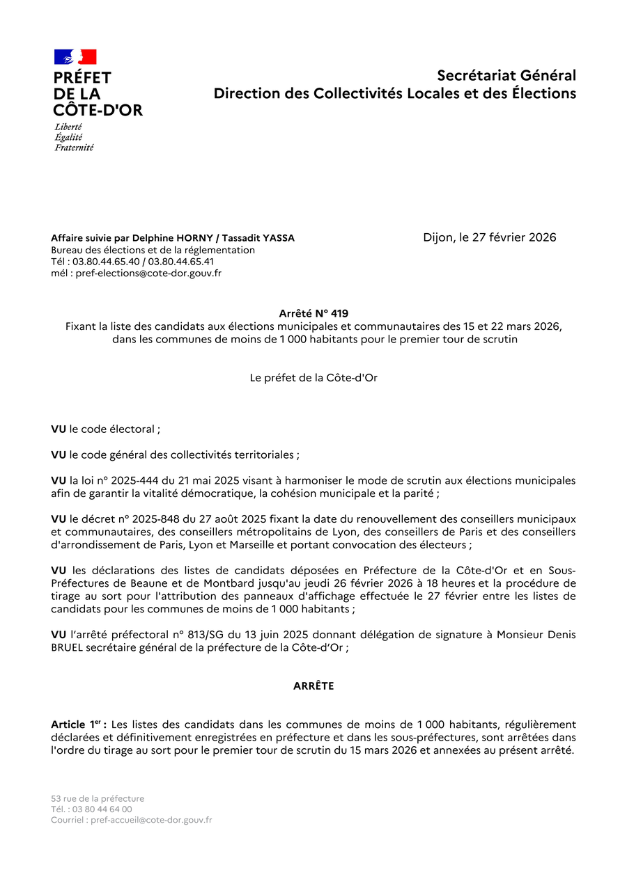 Vous trouverez ci-dessous l'arrêté n° 419 du 27 février 2026 fixant la liste des candidats aux élections municipales et communautaires des 15 et 22 mars 2026, dans les communes de moins de 1000 habitants pour le premier tour de scrutin, ainsi que la liste de la Commune de SAVOISY.