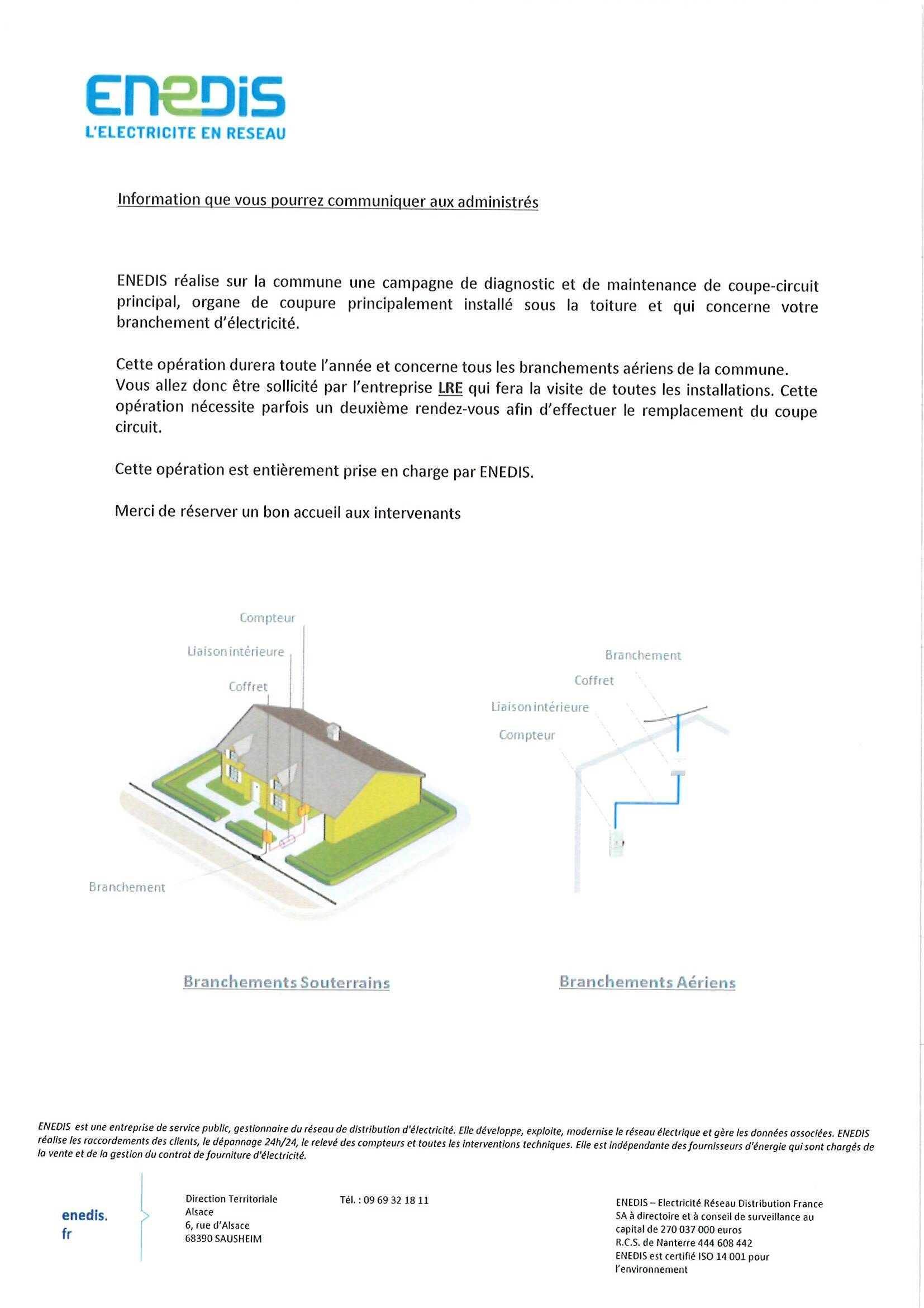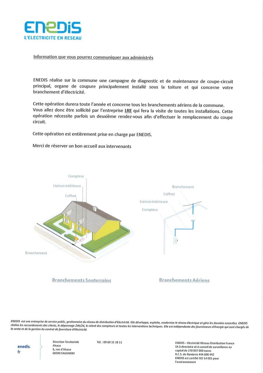 ENEDIS Alsace a débuté une vaste campagne de diagnostic des coupe-circuit en toiture, sur l'ensemble du territoire desservi par l'entreprise. La société LRE s'occupera de la visite des installations. Les techniciens sont autorisés par la mairie à aller à la rencontre des habitants.