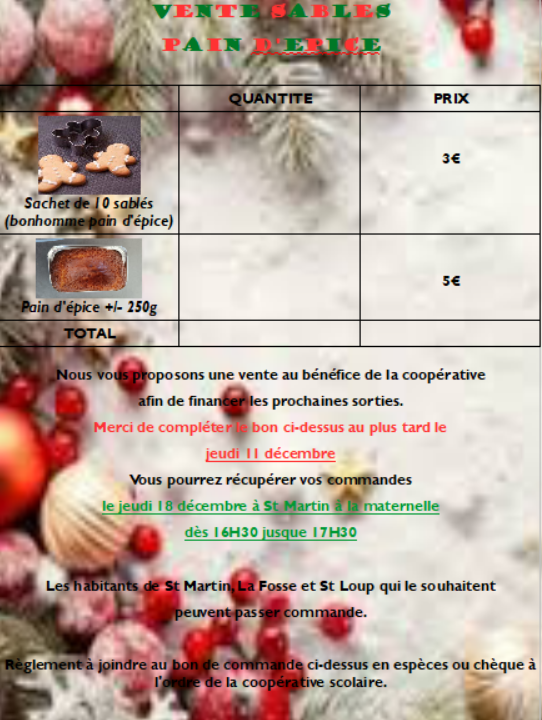 Le bon de commande ci-dessous est à compléter et à deposer au plus tard le jeudi 11 décembre à l'école de Saint-Martin.