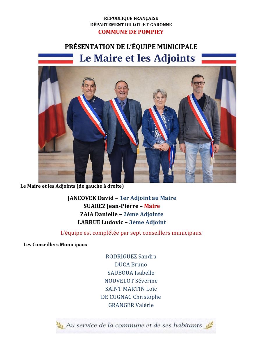 À l’issue des élections municipales Le 27/03/2026 le Conseil municipal de Pompiey a été installé. Lors de sa séance d’installation, les membres du Conseil municipal ont procédé à l’élection du Maire et des Adjoints.