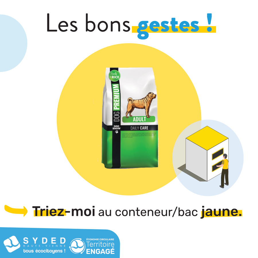 Saviez-vous que les sacs de croquettes pour chiens et chats se trient dans la poubelle ou le conteneur jaune avec les emballages ? ✅