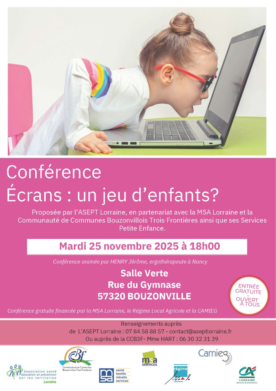 Organisée par l'Association de Santé, d’Éducation et de Prévention sur les Territoires de Lorraine (ASEPT Lorraine), en partenariat avec la CCB3F et les services Petite Enfance, cette conférence vise à sensibiliser les parents, les professionnels et le grand public à un usage réfléchi des écrans dès le plus jeune âge. 📺️📱