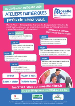 En collaboration avec la CCB3F, Moselle Fibre vous propose des ateliers afin de vous initier à l'utilisation du numériques ! Les ateliers auront lieu du 3 février au 10 juillet 2026 !