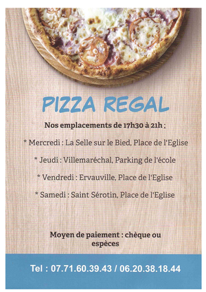 Tous les jeudis, le camion Pizza Regal est à Villemaréchal sur la place de la salle polyvalente rue de la Mairie
