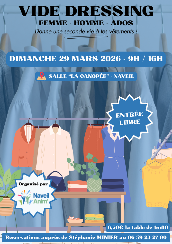 Naveil Anim' organise son 1er vide dressing le dimanche 29 mars 2026 de 9h à 16h dans la salle de "La Canopée" à Naveil ! 😀