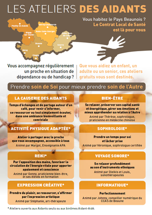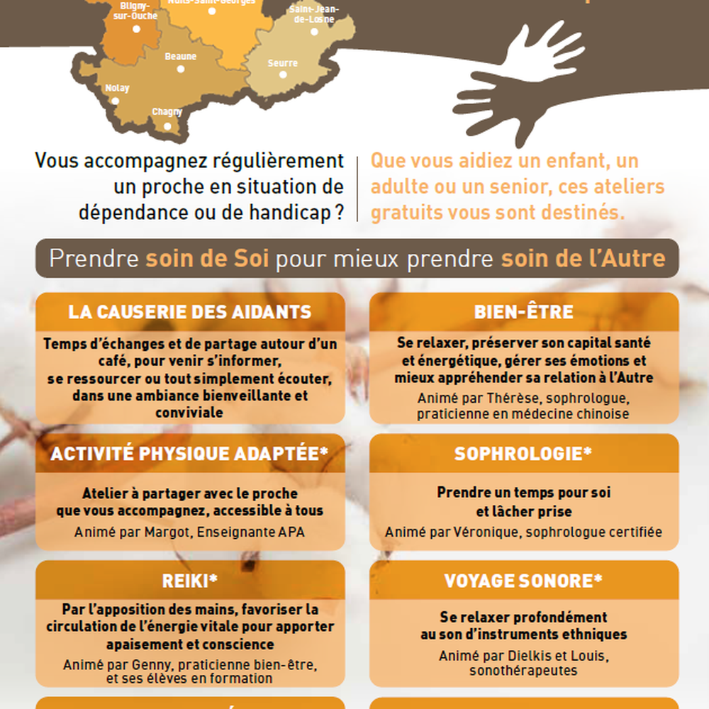 Proposés à BEAUNE, ces ateliers sont accessibles à tout habitant du Pays Beaunois (soit 194 communes du Sud Côte-d’Or et du Nord Saône-et-Loire) accompagnant un proche en situation de dépendance, que cette dépendance soit liée à l’avancée en âge, à la maladie ou au handicap, sans condition d’âge et que le proche en question réside à son domicile ou en institution.