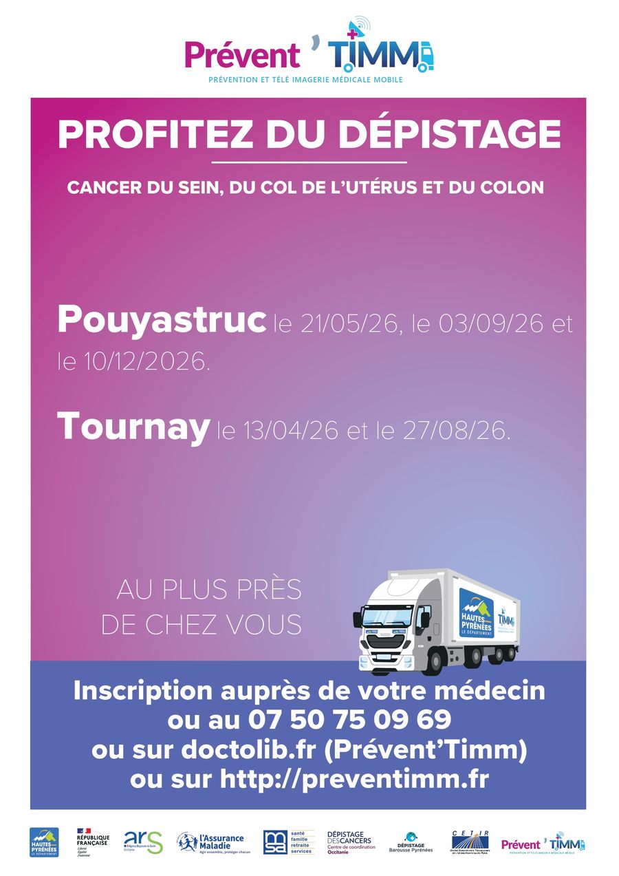 Le Le camion Prévent’TIMM est un dispositif dédié à la prévention santé et au dépistage organisé des cancers du sein, du col de l’utérus et du côlon. Il est piloté par le Département des Hautes-Pyrénées et l’ARS 65, en partenariat avec la CPAM, la MSA, la SELAS Dépistage Barousse Pyrénées, le CETIR ainsi que les professionnels de santé du territoire (médecins généralistes, sages-femmes…).