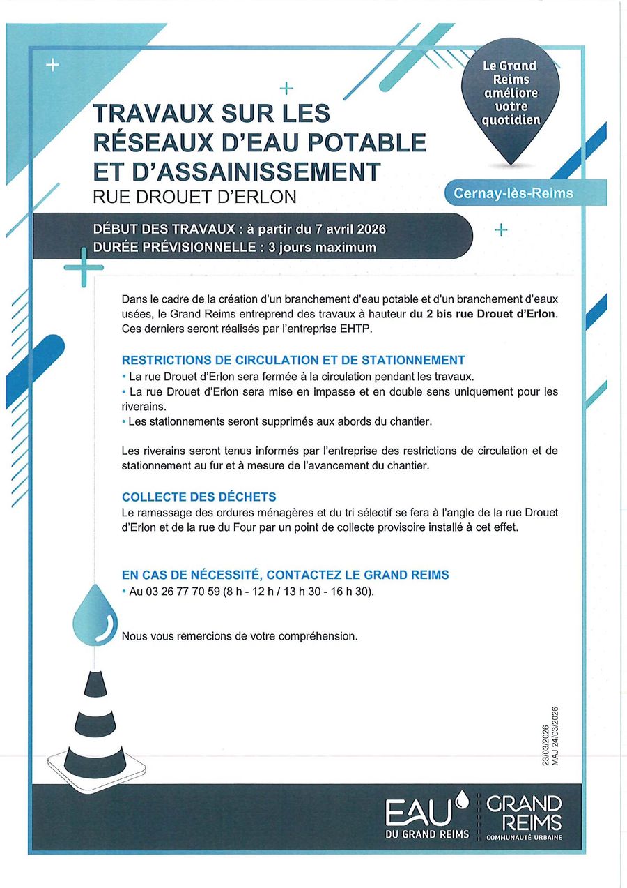 A partir du 7 avril 2026 des travaux sur les réseaux d'eau potable et d'assainissement sont prévus à hauteur du 2 bis rue Drouet d'Erlon pour une durée de 3 jours maximum.