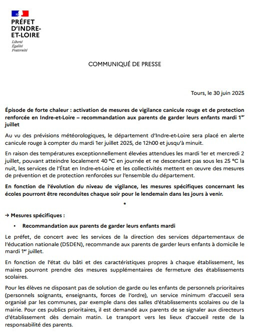 Le département d'Indre-et-Loire passera en vigilance rouge à partir de demain, mardi 1er juillet, à 12h00, en raison de l'intensification de l'épisode caniculaire en cours depuis plusieurs jours, ce qui justifie des précautions renforcées.