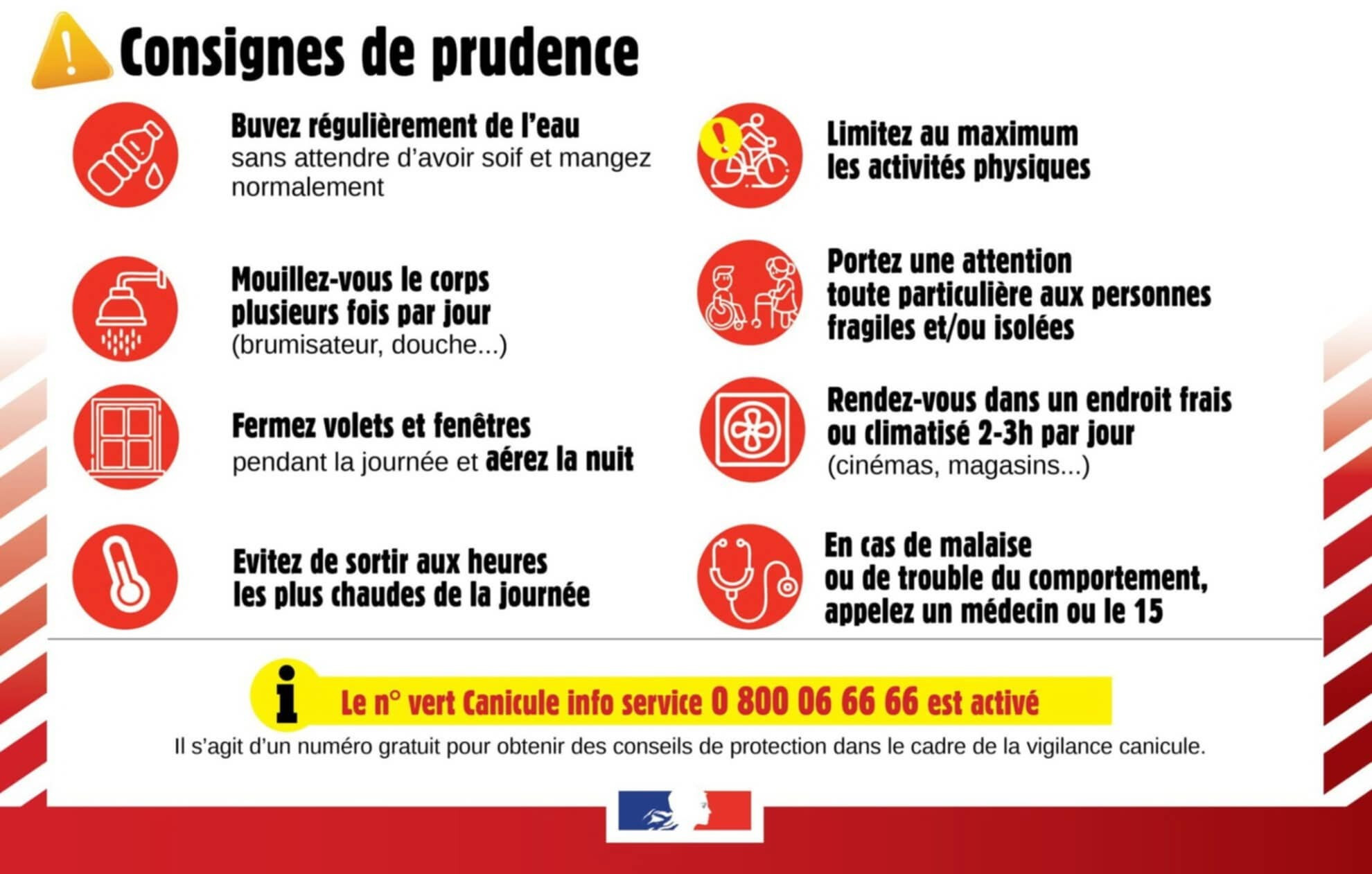 Ce numéro vert permet d’obtenir des conseils pour se protéger et protéger son entourage, en particulier les plus fragiles et pour adopter les bons réflexes face aux fortes chaleurs :