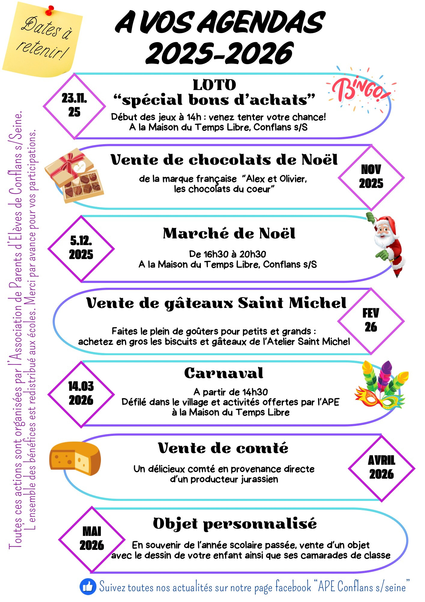 L’association des parents d’élèves des écoles de Conflans sur Seine a le plaisir de vous inviter à ces actions pour cette année scolaire. Les événements tels que loto, marché de Noël et carnaval ne sont pas réservés aux parents d’élèves mais ouvert au public : vous y êtes les bienvenus! L’ensemble des bénéfices est reversé aux écoles maternelle et primaire pour financer des sorties scolaires, spectacles ou matériel pédagogiques. Nous comptons sur vous pour faire vivre notre école. Au plaisir de vous y croiser.