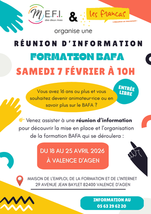 Une réunion d’information est organisée pour présenter la mise en place et l’organisation d’une formation BAFA qui se déroulera du 18 au 25 avril 2026 à Valence d’Agen.