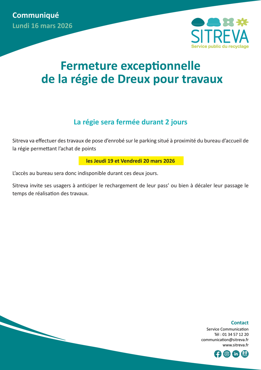 En raison de travaux de pose d’enrobé sur le parking situé au niveau du bureau d’accueil de la régie, Jeudi 19 et vendredi 20 mars, l’accès à celui-ci sera indisponible.