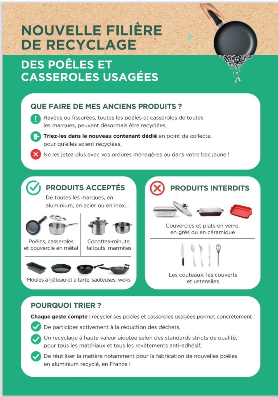 Depuis le 15 décembre, un projet pilote d’1 an est lancé pour la collecte des articles culinaires métalliques usagés, en partenariat avec le Groupe SEB.