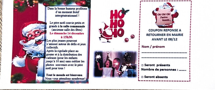 - le dimanche 14 décembre à 15h30 : Noël pour tous , vous êtes tous conviés à profiter d’un moment convivial avec tous les enfants et surtout le Père Noël qui nous rend visite