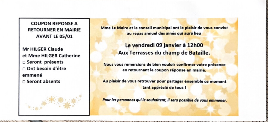 - le vendredi 9 janvier : le repas pour nos aînés, vous recevrez un carton d’invitation dans vos boîtes aux lettres
