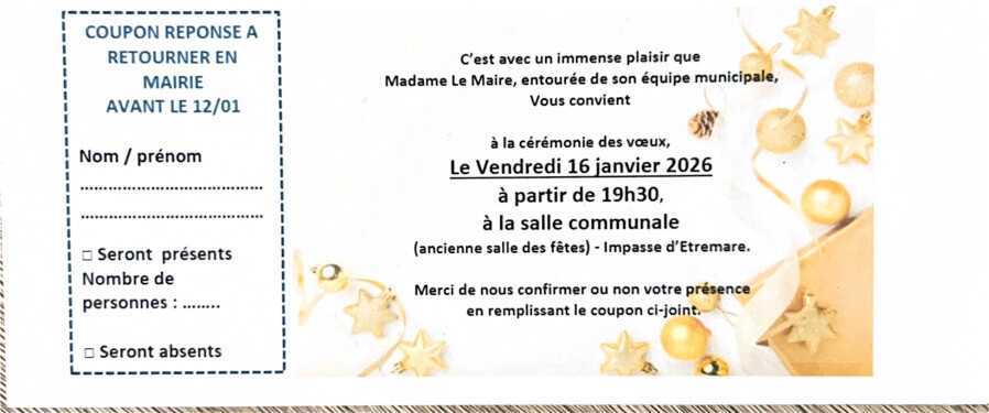 - le vendredi 16 janvier à 19h30 : la cérémonie des vœux , vous êtes tous conviés