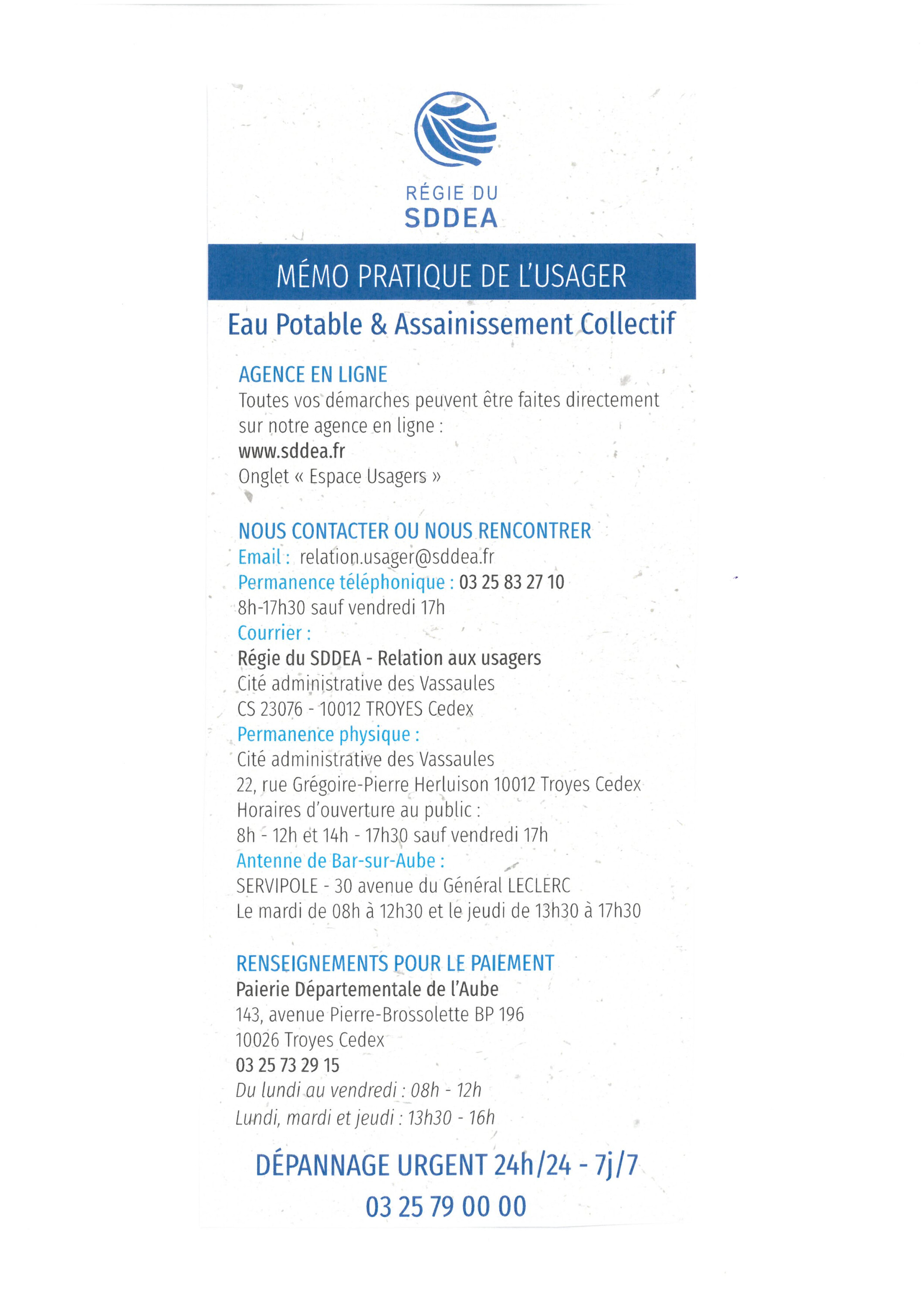 La gestion de l'eau est, depuis le 1er janvier 2025, de la compétence du Syndicat Départemental Des Eaux de l'Aube.