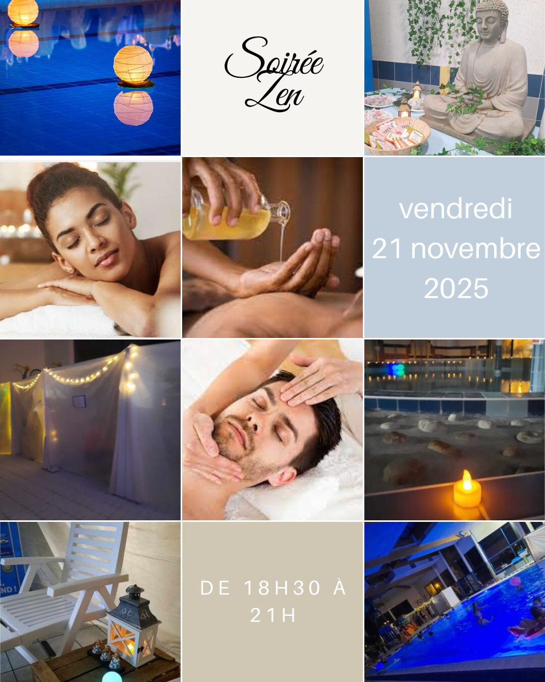 Les créneaux de soins et massages sont tous complets, mais cela ne vous empêchera pas de profiter pleinement de tous les plaisirs de la soirée ZEN !