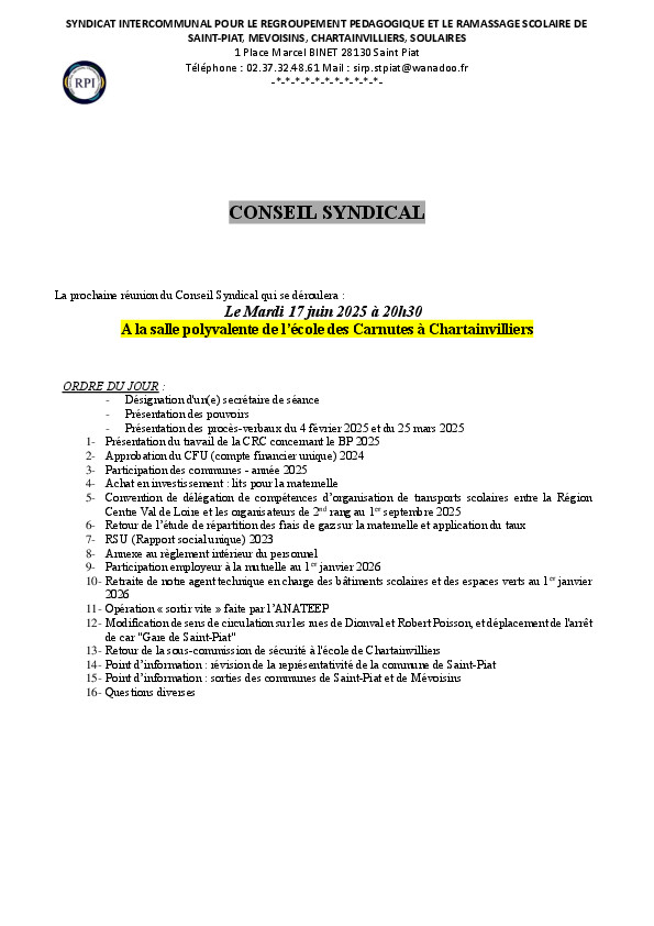 à destination de l'ensemble des parents d'élèves du RPI de Saint-Piat et de Chartainvilliers: