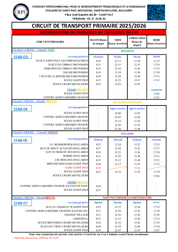 Au vu de la proximité de l'école de Saint-Piat, la commission des transports scolaires de la Région Centre Val de Loire a décidé de supprimer, dans les sens retour, cet arrêt, et ce à compter du lundi 29 septembre, jusqu'aux vacances de Noël.